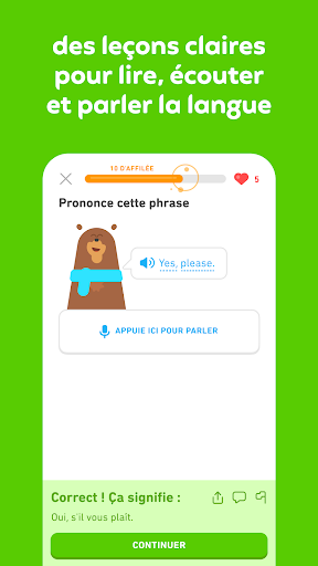 Apprends une langue avec l’appli d’enseignement la plus téléchargée au monde ! Duolingo est une appli fun et gratuite pour apprendre + de 40 langues avec des leçons courtes et interactives. Entraîne-toi à parler, écouter, lire et écrire la langue pour enrichir ton vocabulaire et te familiariser avec les points de grammaire. Conçue par des experts linguistiques et plébiscitée par des centaines de millions de personnes dans le monde, l’appli Duolingo te prépare à avoir de vraies conversations en espagnol, en français, en chinois, en italien, en allemand, en anglais, et bien plus. Que tu souhaites apprendre une langue pour voyager, pour progresser dans tes études ou dans ta carrière, pour communiquer avec tes proches ou pour stimuler ton cerveau, une chose est sûre : tu vas adorer apprendre avec Duolingo. Pourquoi Duolingo ? • Duolingo est fun et efficace. Nos leçons ludiques et nos personnages hauts en couleur t’aident à mieux parler, écouter, lire et écrire la langue. • Duolingo, ça marche. Conçue par des experts linguistiques, l’appli Duolingo s’appuie sur une méthodologie d’enseignement à l’efficacité prouvée pour favoriser la mémorisation à long terme. • Suis tes progrès. Progresse vers tes objectifs et décroche des récompenses et des succès en prenant l’habitude de t’entraîner chaque jour ! • Rejoins + de 500 millions de passionnés. Participe aux Ligues pour réveiller ton esprit de compétition et apprendre au sein d’une communauté qui ne connaît pas de frontières. • Tous nos cours sont gratuits. Apprends l’espagnol, l’anglais, l’allemand, l’italien, le russe, le portugais, le turc, le néerlandais, l’irlandais, le danois, le suédois, l’ukrainien, l’espéranto, le polonais, le grec, le hongrois, le norvégien, l’hébreu, le gallois, l’arabe, le latin, l’hawaïen, l’écossais gaélique, le vietnamien, le coréen, le japonais, le français, et même le haut valyrien ! Ce que le monde pense de Duolingo ️️️️️ : Le choix de la rédaction et « Le meilleur du meilleur » – Google Play « De loin, la meilleure application gratuite pour apprendre une langue. » – The Wall Street Journal « Cette appli et ce site gratuits figurent parmi les méthodes de langue les plus efficaces que j’ai pu essayer… Chaque leçon présente de petits exercices pour parler la langue, traduire des phrases ou répondre à des questions à choix multiples. Et j’en redemande. » – The New York Times « Duolingo détient peut-être le secret du futur de l\enseignement. » – TIME Magazine « … Duolingo est divertissant, léger et fun… » – Forbes Si tu aimes Duolingo, essaie Super Duolingo gratuitement pendant 14 jours ! Apprends une langue plus vite sans les pubs et profite d’avantages exclusifs comme les Vies illimitées et un Répare-série par mois. Pour toute remarque, écris-nous à android@duolingo.com Utilise Duolingo sur le web en te rendant sur https://www.duolingo.com Politique de confidentialité : https://www.duolingo.com/privacy